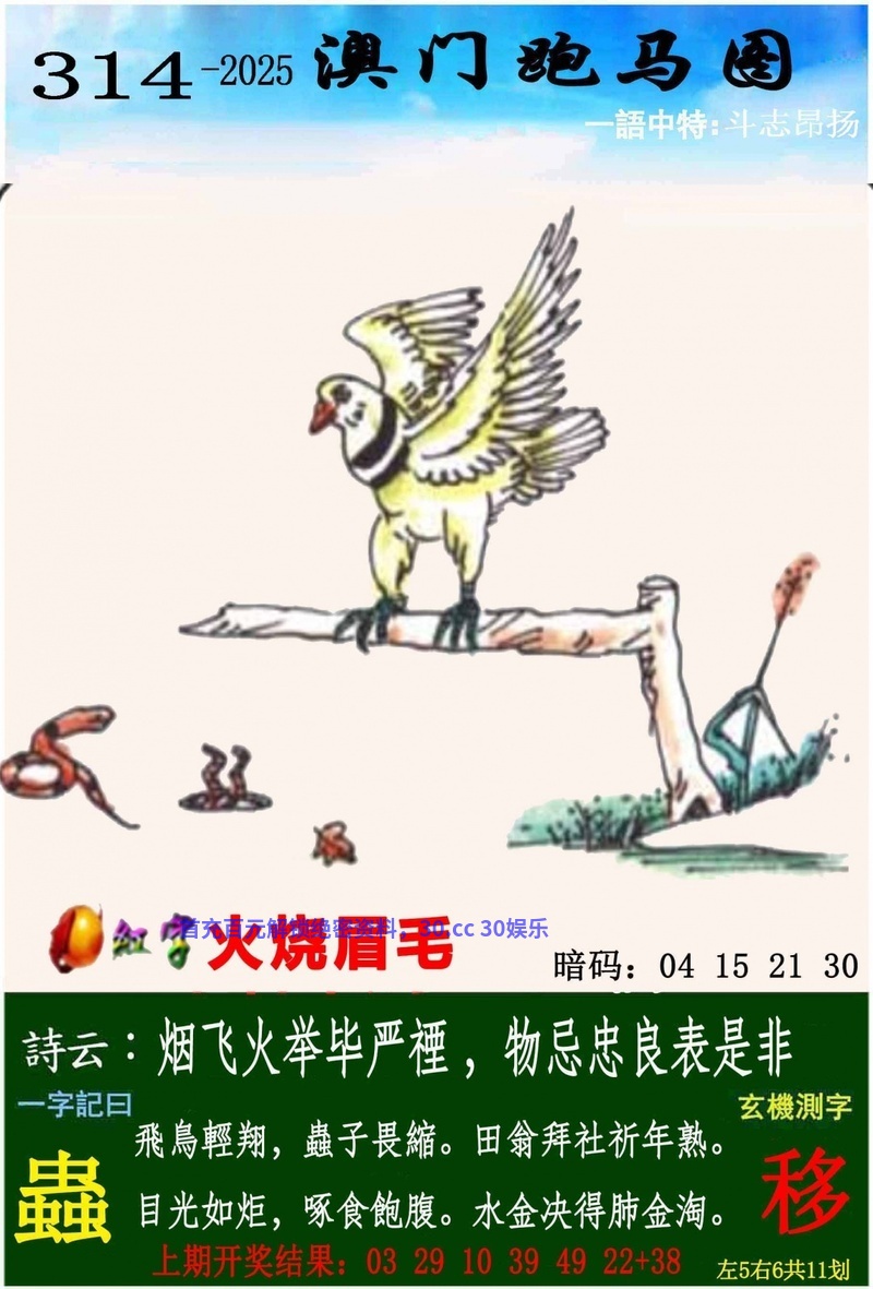 315期一字記曰:【达】 箭在弦上,蓄勢待發,但求一擊可必殺;伺機而動,細心大膽,下定決心目標達。【祁】 解:下定决心目标达解鸡龙蛇猴虎猪 综合取肖:鸡龙蛇猴虎猪 |