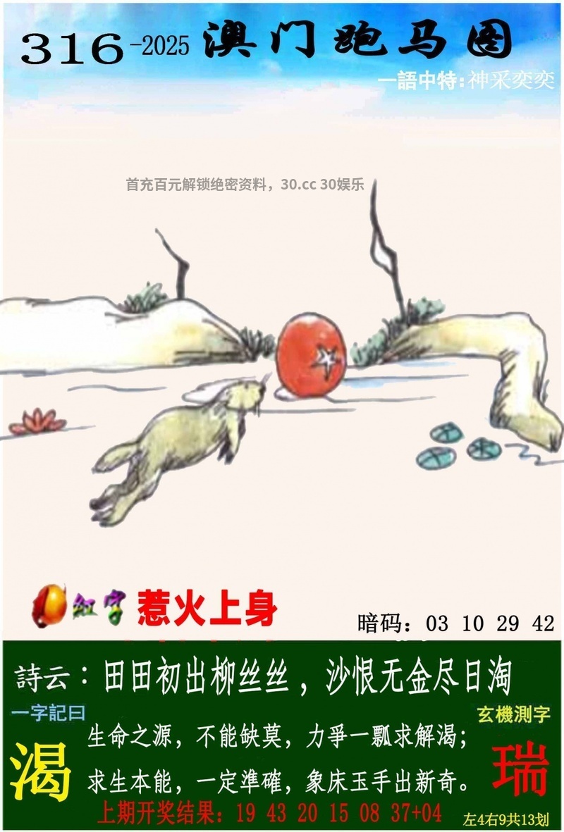 316期一字記曰:【渴】 生命之源,不能缺莫,力爭一瓢求解渴;求生本能,一定準確,象床玉手出新奇。【瑞】 解:沙恨无金尽日淘:尽日淘解日肖蛇马兔龙羊猴 综合取肖:蛇马兔龙羊猴 |