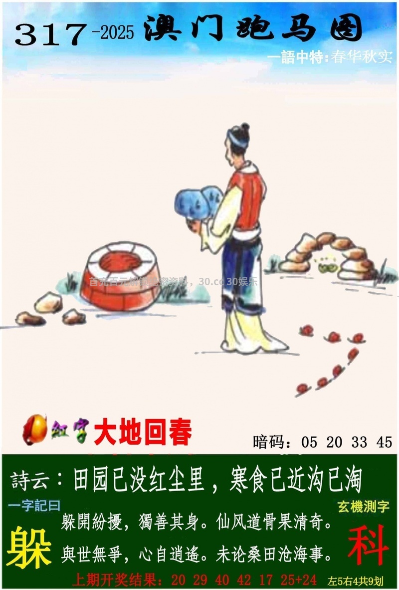 317期一字記曰:【躲】 躲開紛擾,獨善其身。仙风道骨果清奇。與世無爭,心自逍遙。未论桑田沧海事。【科】 解:仙风道骨果清奇解天肖猪马牛猴兔龙 综合取肖:猪马牛猴兔龙 |